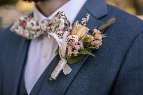 Portraits in the bag, it was a short drive over to Chelsea's parents' home at the foot of Grouse Mountain. Those beautiful modern florals carried out through the decor with charming vintage-inspired touches, striking a perfect balance between old and new. In the backyard, the ceremony played out against lush gardens and the towering backdrop of mountain pines. The ceremony itself, officiated by a friend, was kept light-hearted and fun. Example? Rock-Paper-Scissors over who read their vows first. Heartfelt personalised vows brought plenty of laughs along with a few tears, and all of it punctuated at the end with a shower of brightly coloured dried flowers and wildflower seeds over the happy couple.
